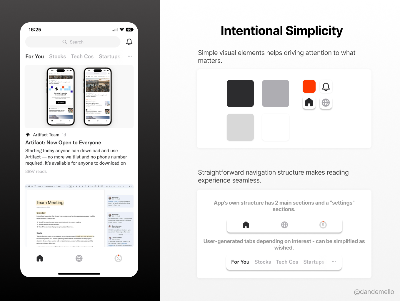 Artifact chose to build a straightforward navigation using minimal visual elements — there are only 3 sections (with Settings), the brand’s main colors and black and white and iconography and typography are both bland.
